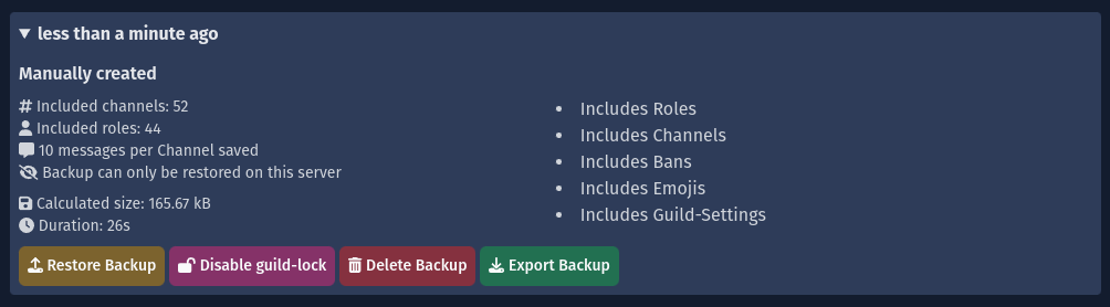 | Servereinstellungen | Backups werden Server-Namen, -Icon, -Einstellungen (wie den AFK-Kanal), Auto-Moderations-Regeln und mehr beinhalten. |